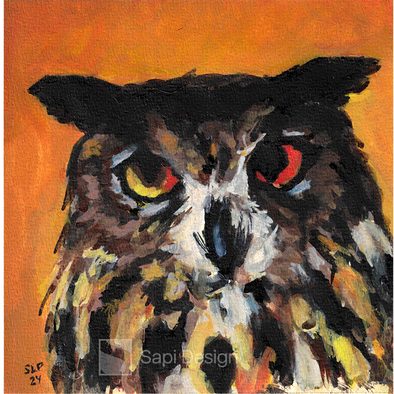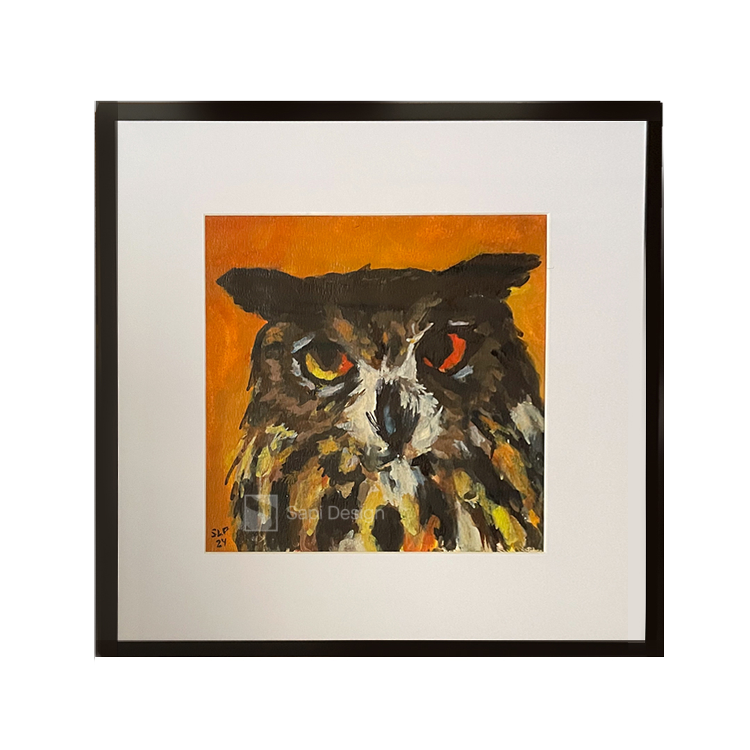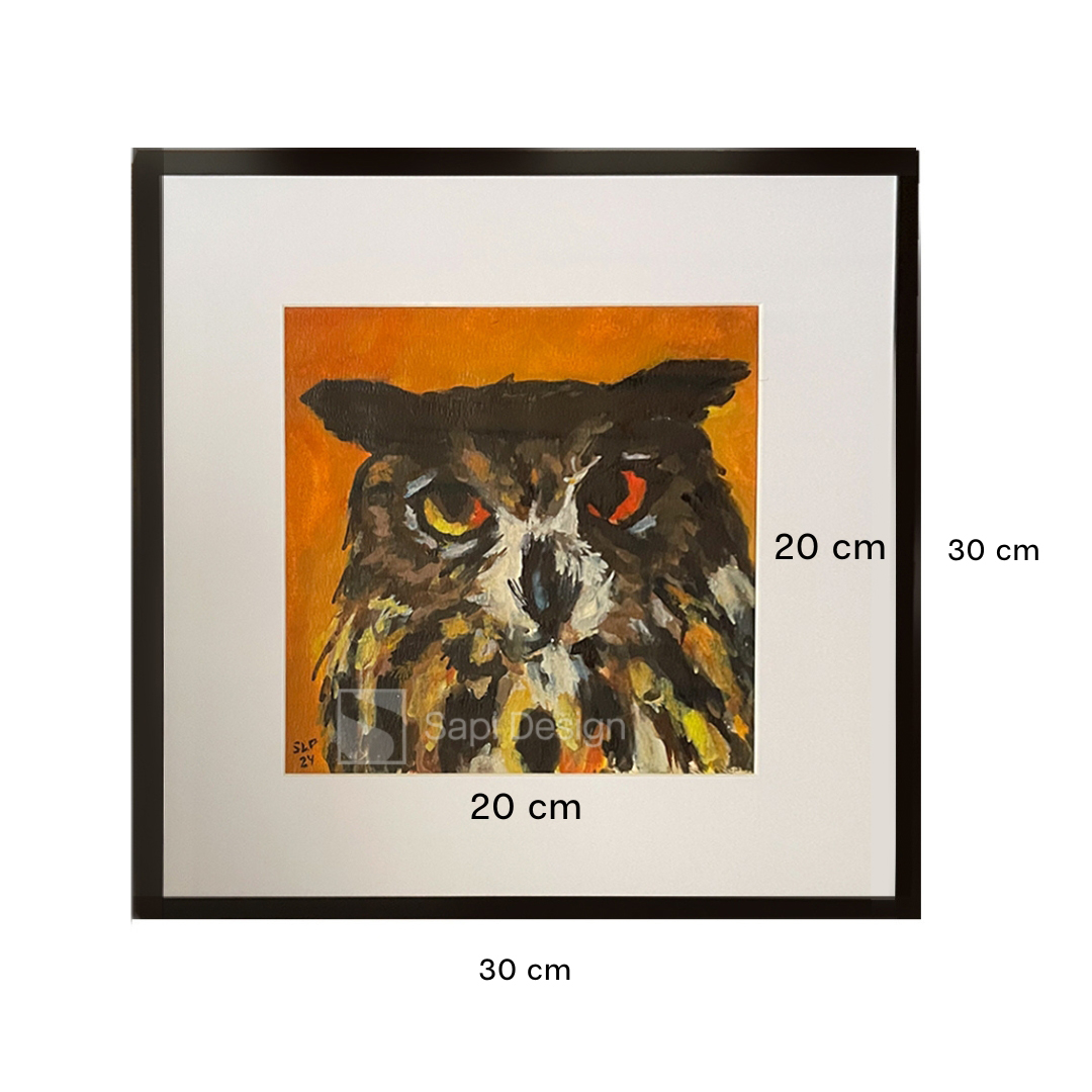 Huuhkaja – vaikuttava ja teräväkatseinen lintu sekä ulkonäöltään, että ääneltään. Teos on alkuperäinen vesivärimaalaus valmiskehyksissä. Teoksen koko 20 x 20 cm ja kehykset 30 x 30 cm.