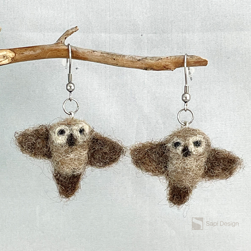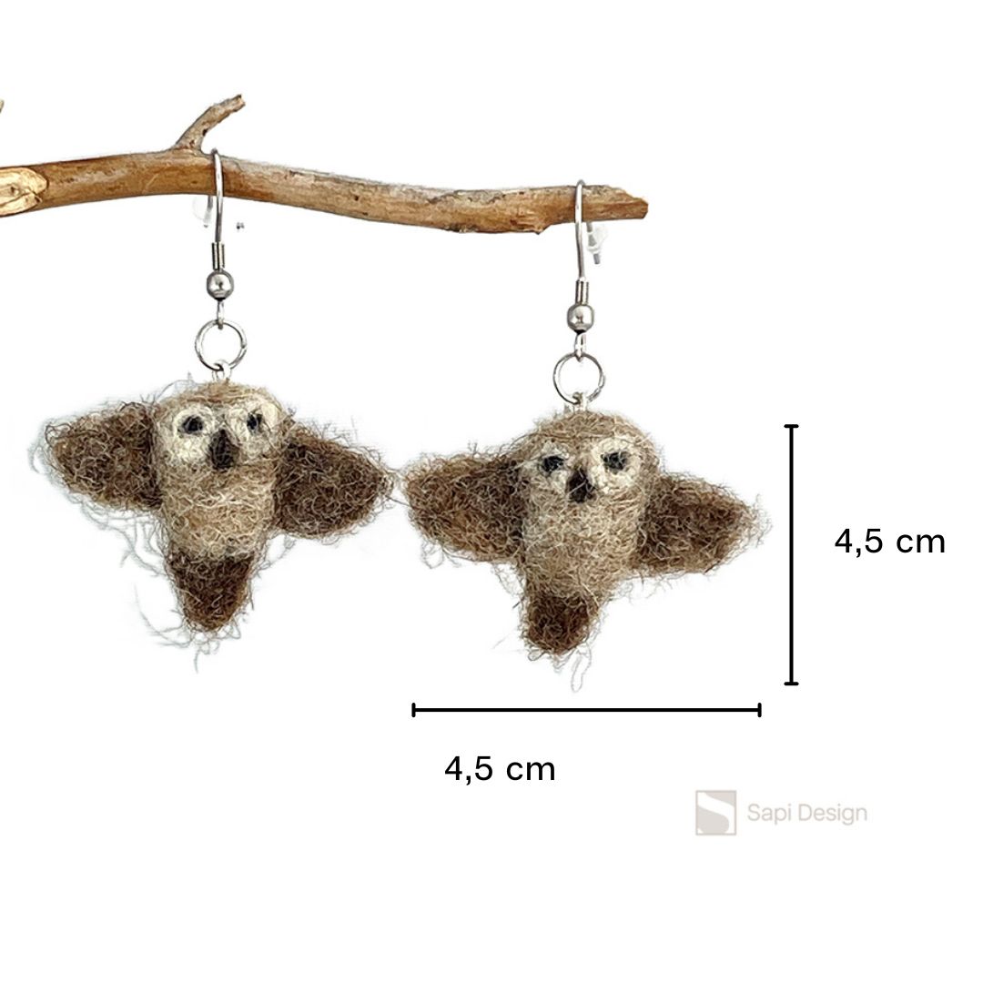Neulalla huovutetut höyhenen kevyet söpöt pöllökorvikset varustettuna kirurginteräksisillä koukuilla sekä silikonisilla stoppareilla.